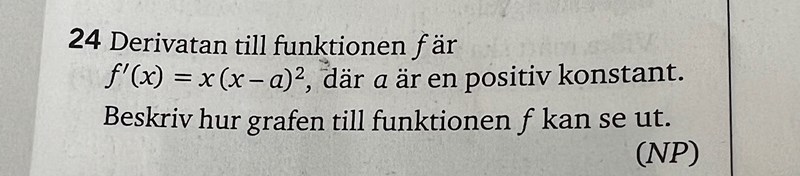 Pröva att rita upp grafen f'(x), så att x=0 och x=a ingår i grafen. Tänk nu att denna graf motsvarar en derivata. Hur borde motsvarande funktion se ut för att dess derivata skall bli som du ritat?