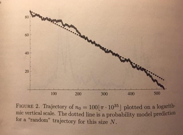 Jag undersöker ett problem som har två villkor: Om talet är jämt så ska det divideras med två, och om det är udda så ska det multipliceras med 3 +1 och divideras med 2. Detta ska upprepas för varje tal tills det når 1. Detta leder i sin tur till att varje tal har ett bestämt antal iterationer till 1.  Jag har försökt programmera en graf där man kan se trajektorian för ett tal på en vertikal logaritmisk skala, men jag får inte riktigt till det.  Jag har försökt återskapa den här grafen: