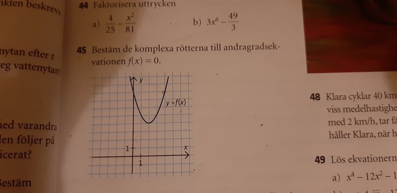 Så här skulle jag ha gjort: Man ser av grafen att symmetrilinjen är x=2, så f(x)=(x-2)2+4.Eftersom detta är Ma2 har alla andragradsekvationer reella koefficienter, och i så fall kan rötterna skrivas som .