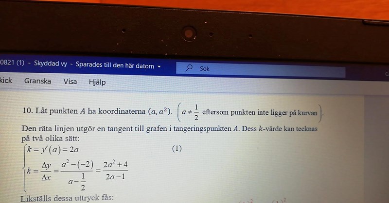 Nästa steg är att ta t ex en linjal och lägga den så att den passerar genom punkten A och tangerar parabeln. Den kommer att ha positiv lutning, ganska brant.