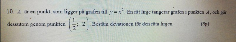 Kalla tangeringspunkten för nånting, t ex (t,t2). Nu kan du räkna fram riktningskoefficienten på två sätt: dels är riktningskoefficienten lika med derivatan av funktionen y = x2 i punkten t, dels skall linjen gå genom punkterna (t,t2) och (½,-2). Kommer du ihåg hur man beräknar k-värdet när man vet två punkter på linjen?