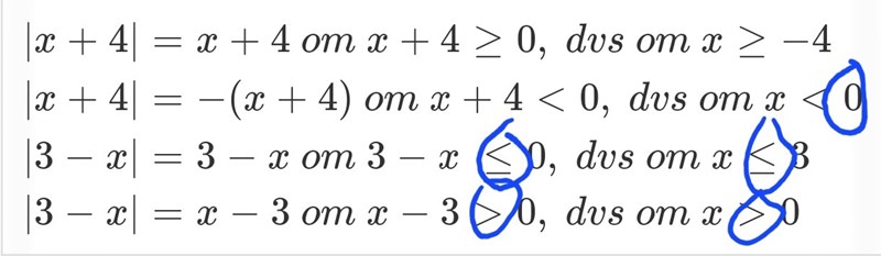 x+4=x+4 om x+40, dvs om x-4x+4=-(x+4) om x+4<0, dvs om x<-43-x=3-x om 3-x 0, dvs om x33-x=x-3 om x-3>0, dvs om x>3