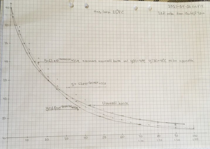 Jag har för mig att jag gjort detta experiment med ca 1 dl vatten i en pappmugg under ca. 15 min (med mätningar var 30:e sekund) och fått riktigt fina värden. Man kan även jämföra med och utan plastlock på pappmuggen. Då borde man få olika värden på , eftersom vi har mindre värmeutbyte med omgivning med ett lock.