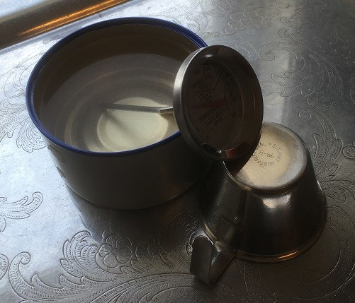 Den placerades på en metallbricka uppallad c:a 15 cm för att det skulle finnas luft med omgivningstemperatur 21,8o runt om. (Ett tidigare försök med kastrull placerad på bänk gjorde att det avsvalnade för sakta)