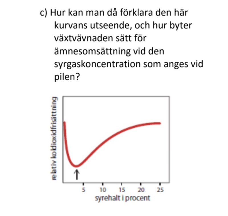I delfråga a och b har jag kommit fram till att det bildas mer ATP i cellandningen än det gör vid jäsning och att det vid jäsning frisätts mer koldioxid per molekyl ATP. I c vill de nu att jag ska förklara utseendet av grafen. Vid lägre syrehalt bör väl cellerna tillta sig mer på jäsning och därför frisätta mer koldioxid, då borde väl grafen stiga med ökad syrehalt, men grafen sjunker till en minimipunkt och sedan stiger den igen. Kan någon förklara varför grafen ser ut som den gör?