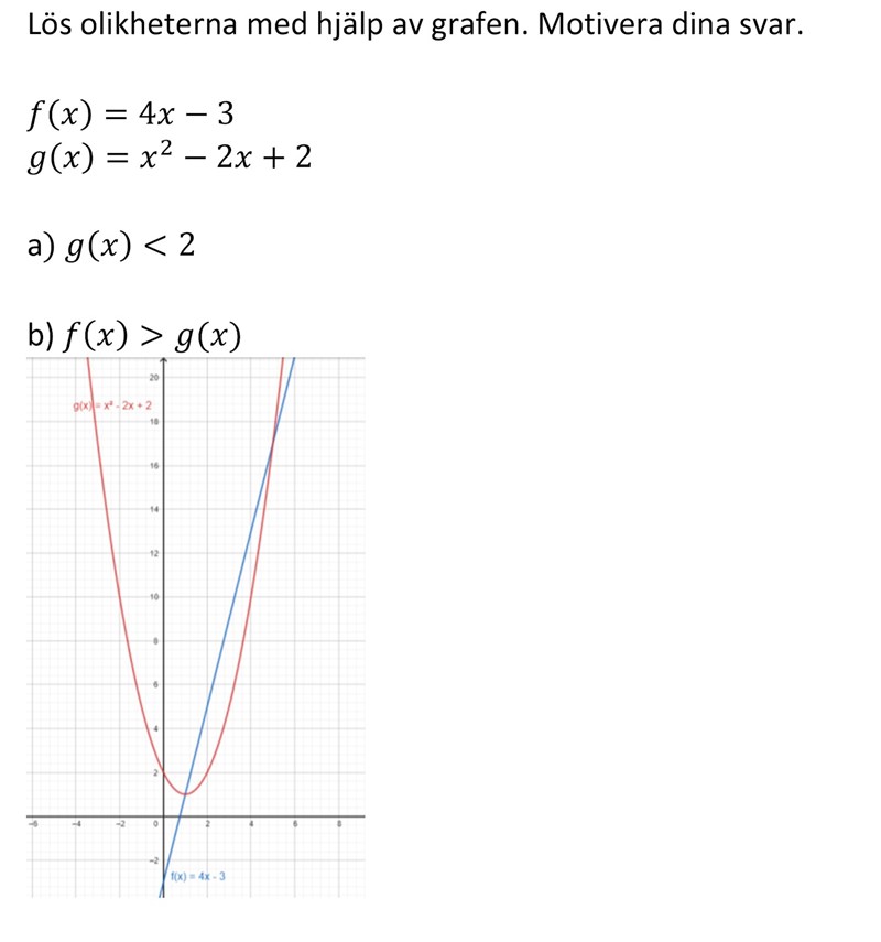 Och som svar a) skriver man lösningen till olikheten f(x)<2 är de x-värdena där funktionen g(x) har en mindre funktionsvärde än 2