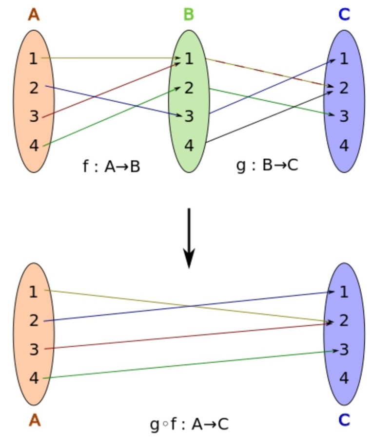 Med funktioner, definitions- och målmängder samt avbildningar enligt bilden: