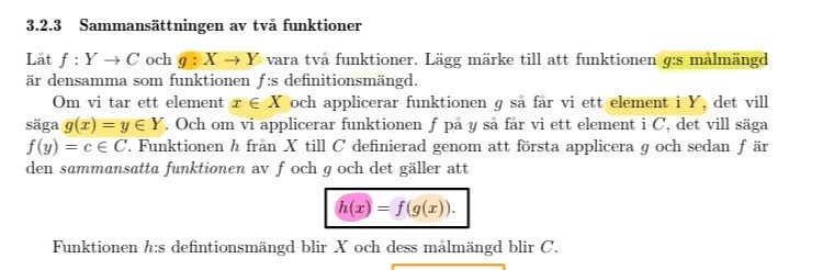- Värdemängden till den sammansatta funktionen g°f består endast av elementen 1, 2 och 3.