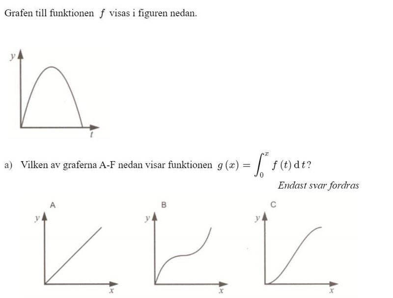 I sin helhet är det lätt att utesluta Graf A med tanke på att den primitiva funktionen av f(x) är en tredjegradsekvation, men sedan tycker jag att det blir svårt att avgöra graf mellan B och C. I graf B ser vi att det finns en terasspunkt, men vet inte hur jag kan utgå ifrån det.