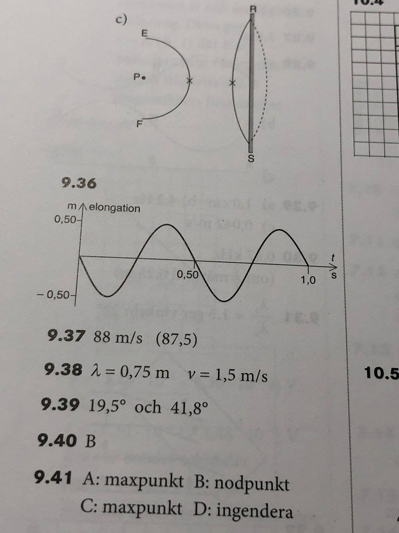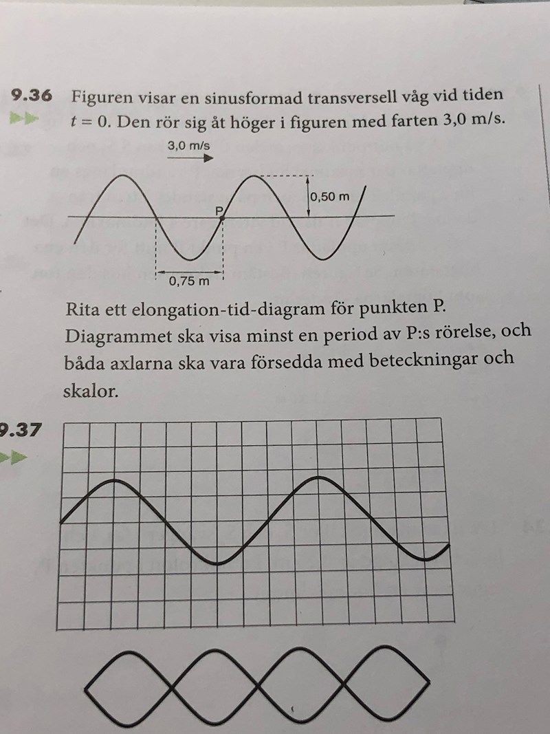 Hej, hur förstår man att punkten P i uppgift 9.36 börjar att röra sig nedåt? Jag antar att riktningen på hastigheten spelar in, men ser inte riktigt hur. Jag vet också att varje punkt i en transversell våg rör sig upp och ner. Tacksam för hjälp.