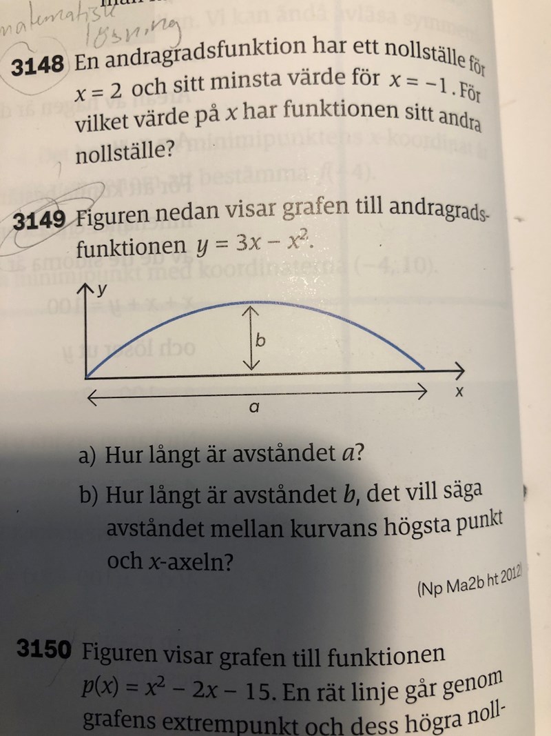 Det är uppgift 3149 jag tittar på. Jag har hittills kommit fram till att b=3(a/2)-(a/2)2 men har lite svårigheter med a) - uppgiften