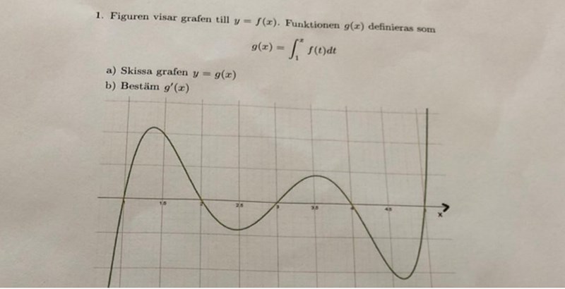Okej jag förstår poängen. Man ska räkna ut arean under grafen f(x) för det kommer ge oss g(x) vid en viss punkt x.