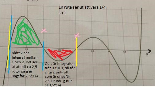 Men kan du förklara varför du räknar du arean? Räknar du ut arean mellan intervallet x=1 och vilket intervall?