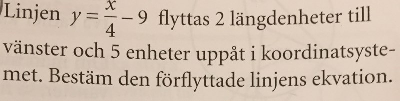 Börja med att rita upp den ursprungliga funktionen. Välj en punkt på linjen. *Markera en punkt som ligger 2 steg till vänster och 5 steg uppåt från denna punkt. Välj en ny punkt på den ursprungliga linjen. Upprepa från * tills du kan se den nya linjen. Ändras k? Ändras m?