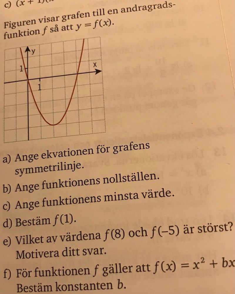 på e) får du tänka att du har en symmetrisk funktion med symmtrilinjen vid 2 vilken av f(8) och f(-5) är närmst symmetrilinjen?