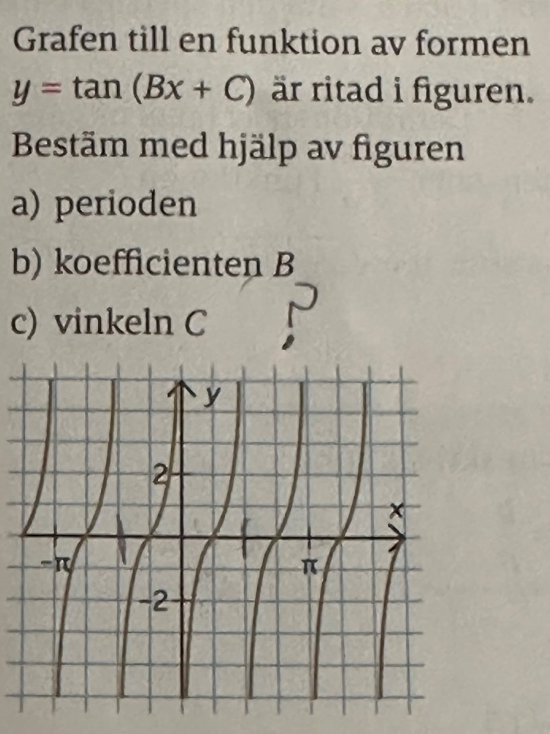 Jag får däremot fel svar på delfråga c). Jag försökte lösa den genom att grafiskt avläsa hur mycket grafen är förskjuten i x-led. Hur jag tänkte var att varje "streck" på x-axeln representerar (π/4) förskjutning till vänster eller höger, och då funktionen är förskjuten 1 steg åt höger eller vänster, jämfört med samma funktion utan förskjutning i x-led har jag felaktigt kommit fram till svaret att C= +- (π/4).