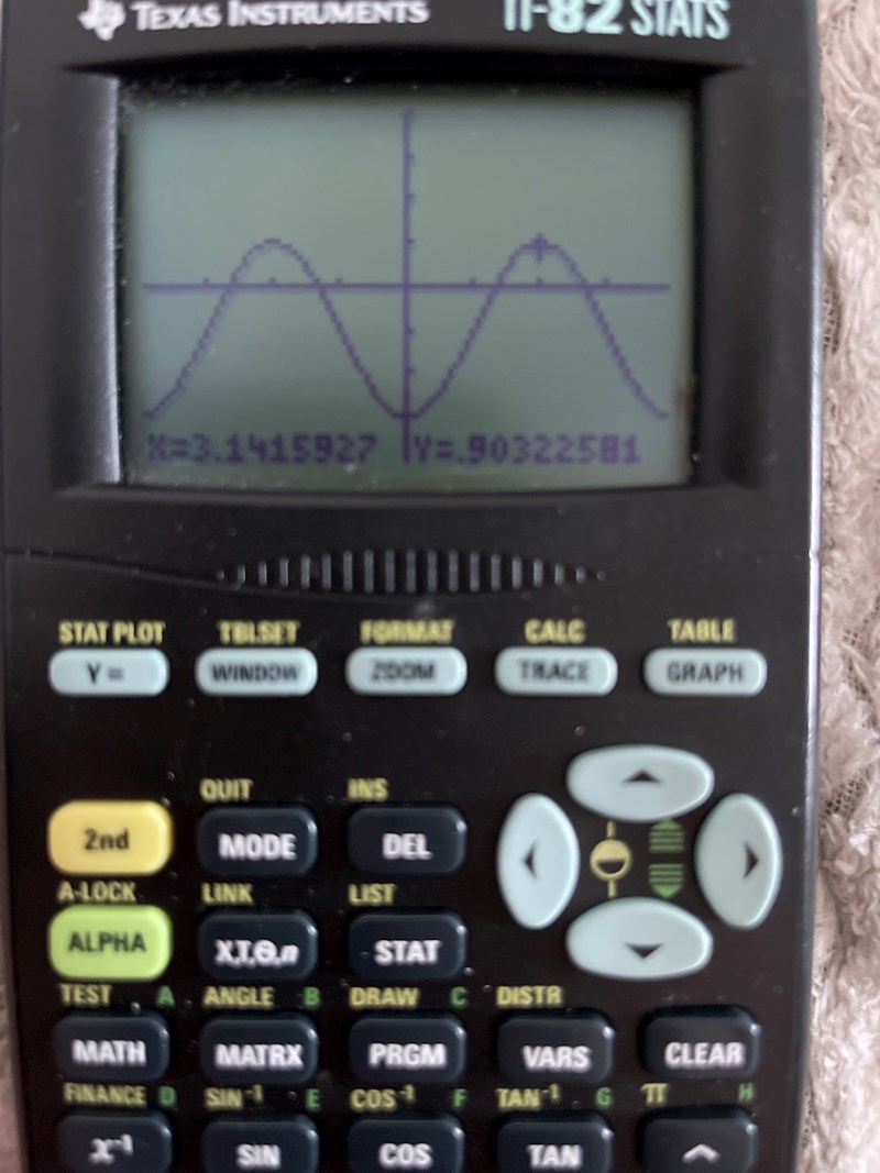 Katarina149 skrev:Så här ser grafen ut. Grafen har en maximipunkt då x=pi och y=0