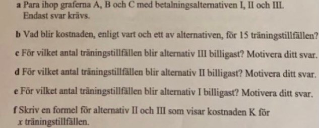 Jag behöver hjälp med att motivera C, D och E. jag vet för vilka antal träningstillfällen det är billigast.