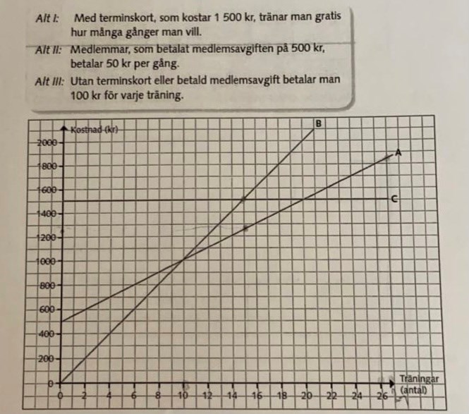 Den graf som ligger lägst vid ett visst antal träningstillfällen motsvarar det upplägg som ger lägst kostnad för just det antalet träningstillfällen.