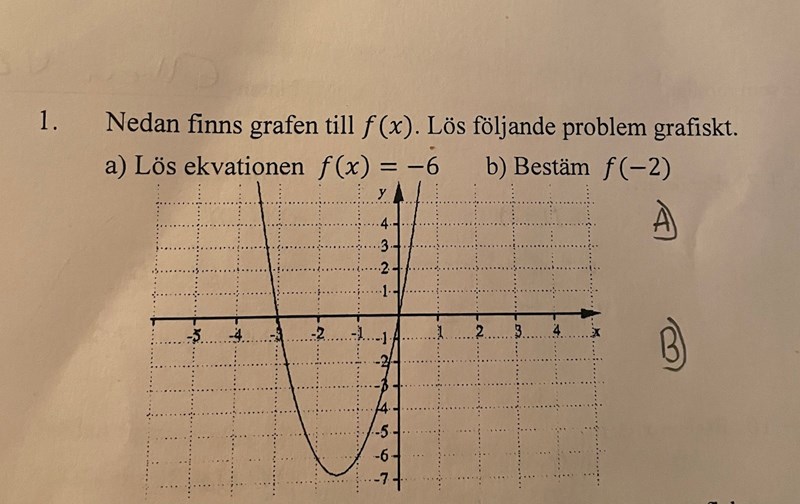 För vilka x värden är funktionen värde -6, se blå linjen.