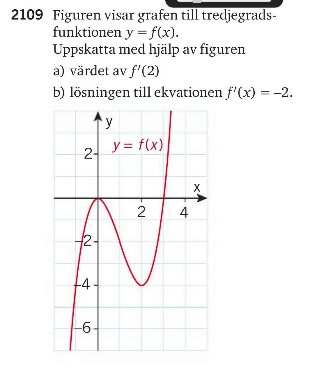 Och för x=1 är derivatan -3. Den är -2 för x= 1 ±13 (om man genom att läsa av punkter konstruerar f(x)).