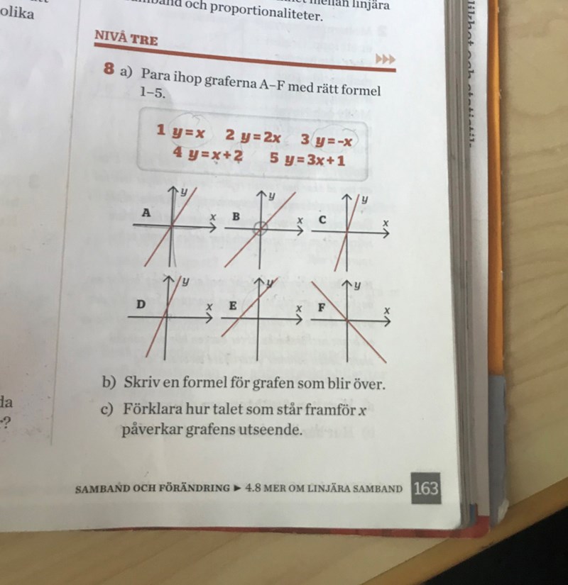 Behöver hjälp med hur man löser denna uppgift, förstår nästan ingenting, men jag började med att gissa att y=x är graf B, hur ska jag gå vidare för förstår inte hur det som står framför x påverkar grafens utseende