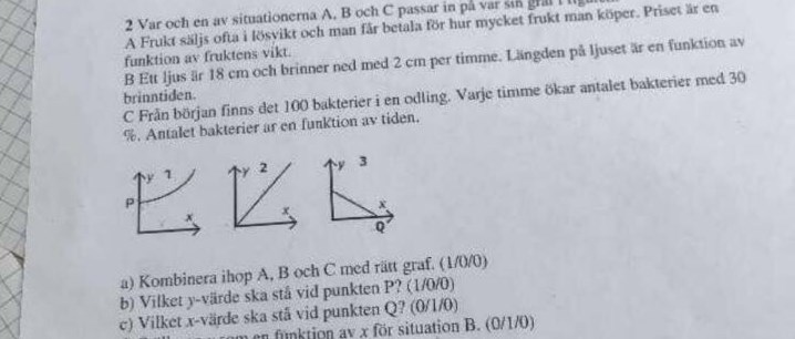 Uppgft 2c) Ljuset är vid tiden x = 0 18cm högt/långt. Då x = Q är dess längd y = 0 cm. Hastigheten med vilket det har brunnit ned är angivet till 2 cm per timme.