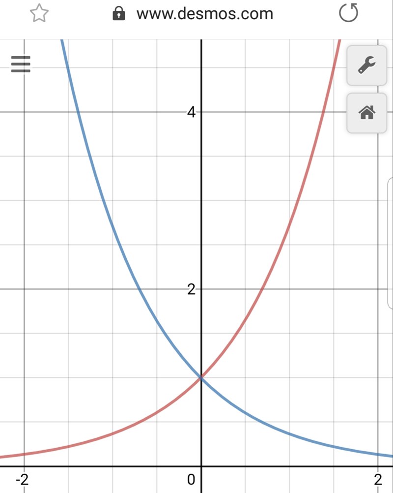 Kurvan g(x)=e-x är en spegelbild (i y-axeln) av kurvan f(x)=ex.