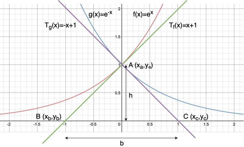 Graferna till f(x)=e^x och g(x)=e^-x skär varandra i en punkt A. Tangenten till respektive kurva i denna punkt skär x-axeln i punkterna B och C. Beräkna arean av triangeln ABC.