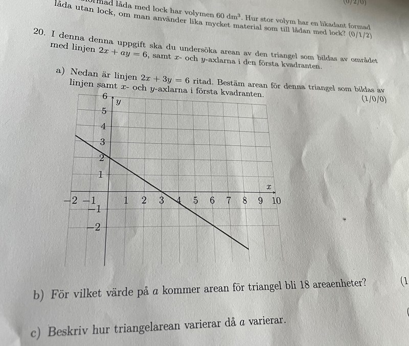 Jag lyckades faktiskt klara av b uppgiften nu genom att lösa vad x respektive y är när linjen skär axlarna men C uppgiften har jag fortfarande problem med, tips på hur jag kan tänka?