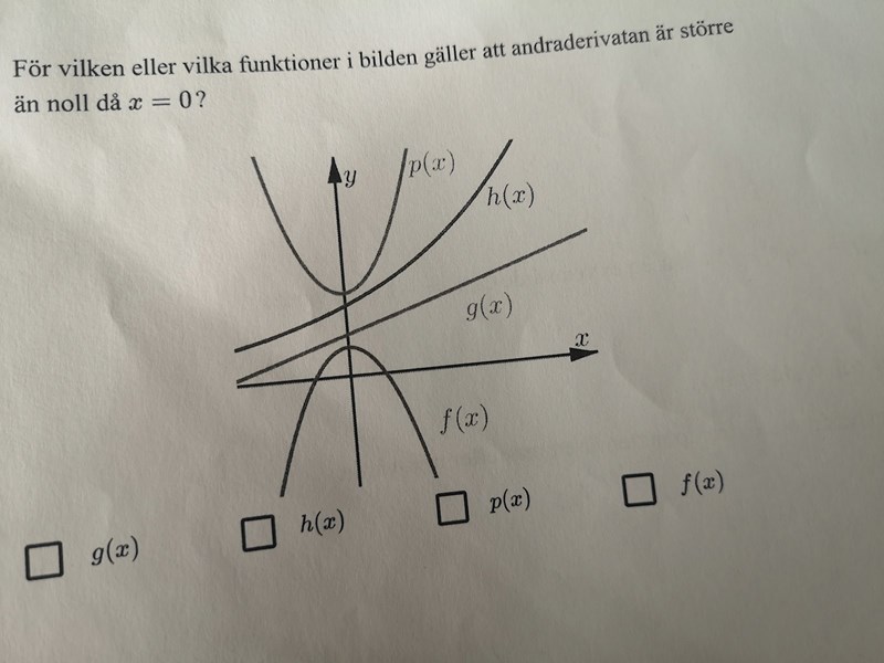 Jag kan räkna mig fram till att p(x) blir 2 oavsett vad x är, så det är ett rätt. Samma sak med g(x) samt f(x) kan jag räkna andraderivatan och ser att g(x)=0 och att f(x)=-2, alltså inte rätt. Jag tänker mig att h(x) är ett alternativ eftersom jag tänker mig att det möjligtvis kanske är en exponentialfunktion, det vill säga att exponenten kanske är högre än 0, så att det blir en andraderivata med ett högre värde än 0. Eller hur ska man tänka med h(x)?