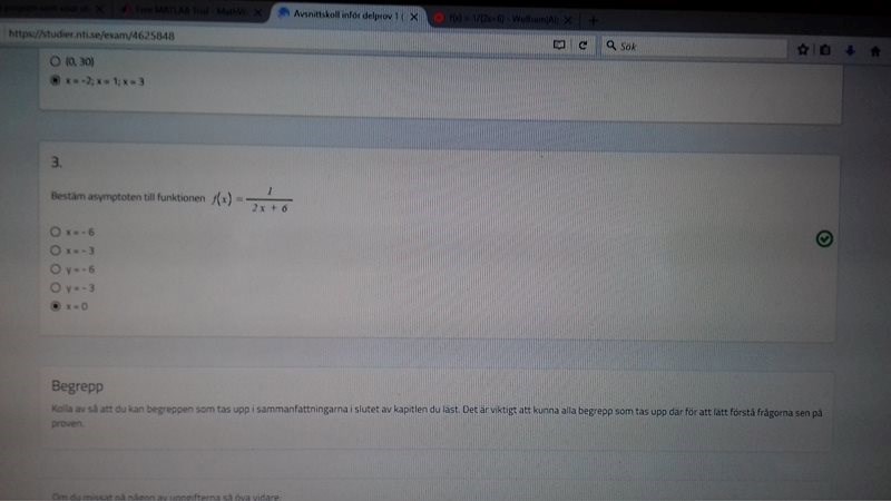 3 är inte rätt. (Den vertikala/lodräta) asymptoten är där funktionsvärdet är odefinierat, dvs då nämnaren = 0
