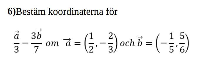 ii_noor06 skrev:Smaragdalena skrev:Hur ser vektorerna a/3 respektive -3b/7 ut? (Du kan multiplicera in konstanten i parentesen.)