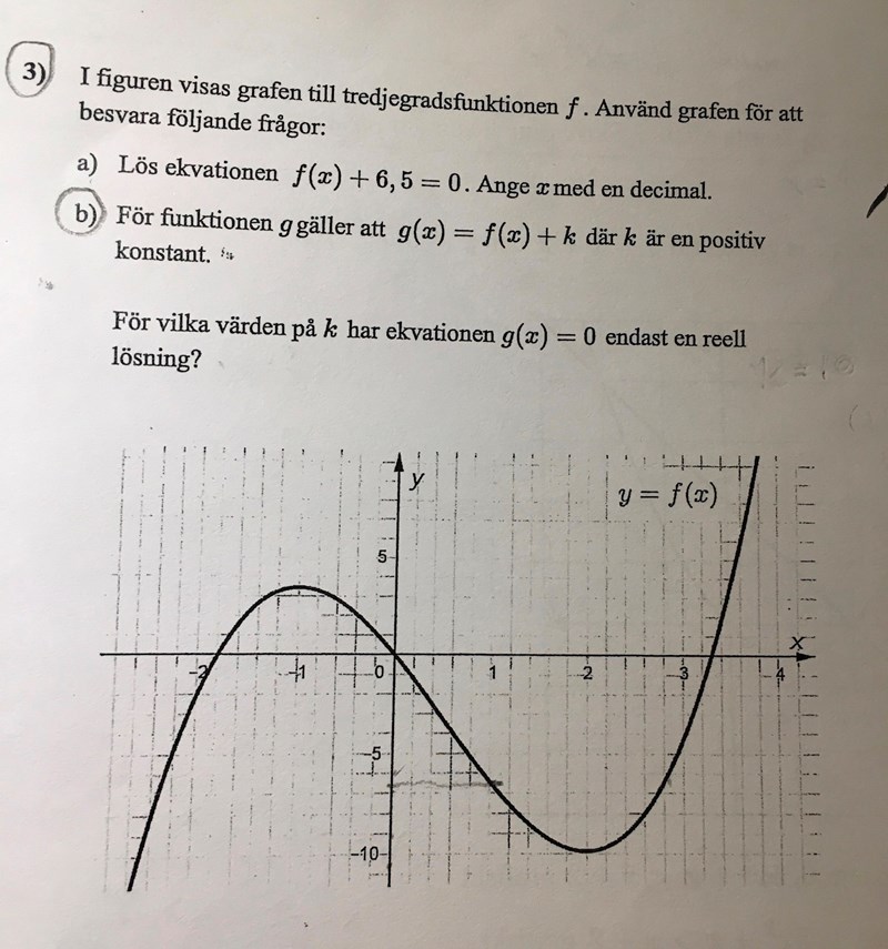 Här tänkte jag bara att eftersom det minsta värdemängden är -10 krävs det att k=10 för att grafen ska snudda vid x-axeln och bara få en reell rot.