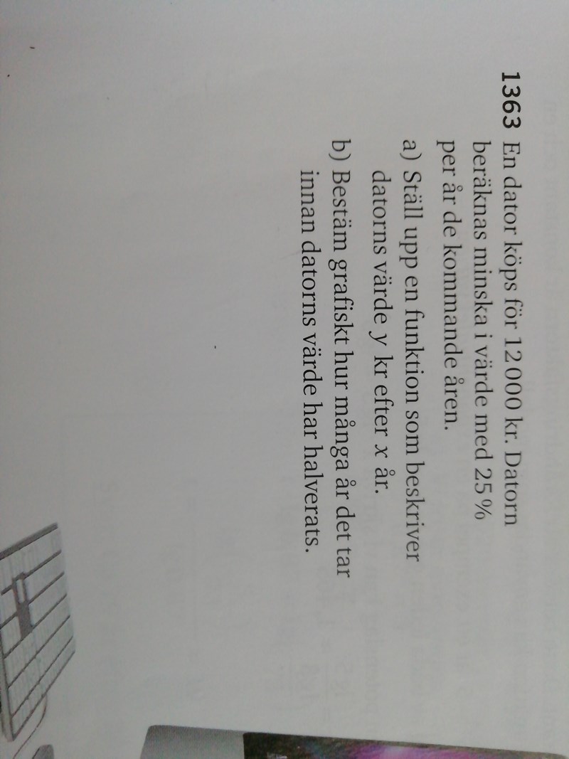 B, 12000/2=6000 (värdet har halverats) Alltså: 6000=12000*0.75^xOch då skriver jag in "y=6000" och "y=12000*0,75^x" men får bara en graf, vad har jag gjort för fel?
