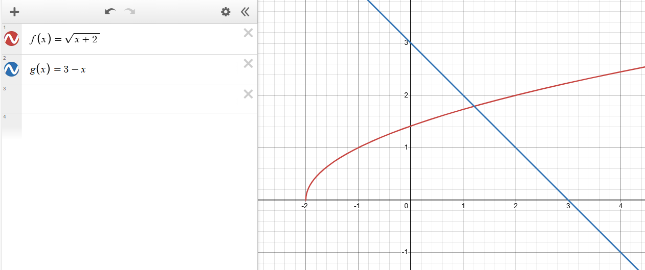 Rimligen får du använda något digitalt hjälpmedel. Här i Desmos har jag ritat upp två funktioner, en för VL och en för HL. Som du kan se skär de varandra en enda gång. Det finns alltså en enda rot (lösning) för ekvationen.