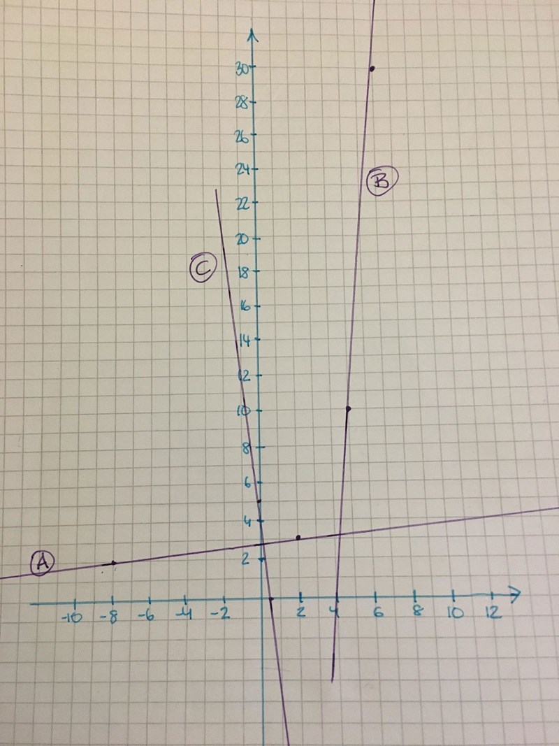 Om jag ska vara petig så ser det ut som att linje C korsar y-axeln vid 4 istället för 5. Det kan skapa lite problem om du ska lösa uppgiften grafiskt.