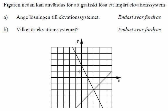 a) Lösningen till ekvationssystemet hittar vi i skärningspunkten mellan de två linjära funktionerna. Vad är x-värdet respektive y-värdet då?