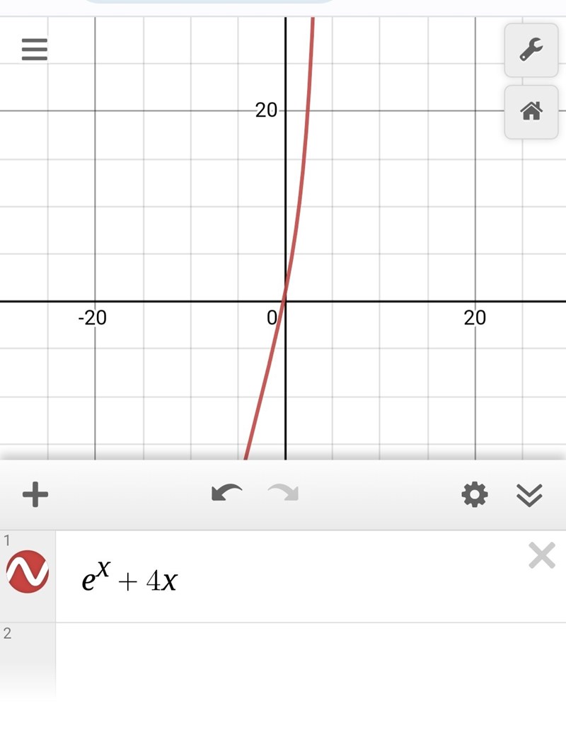 Denna derivata kommer aldrig att vara noll eftersom både e^x och +4 alltid är positiva (för alla reella x), det finns alltså inga extrempunkter, överens?
