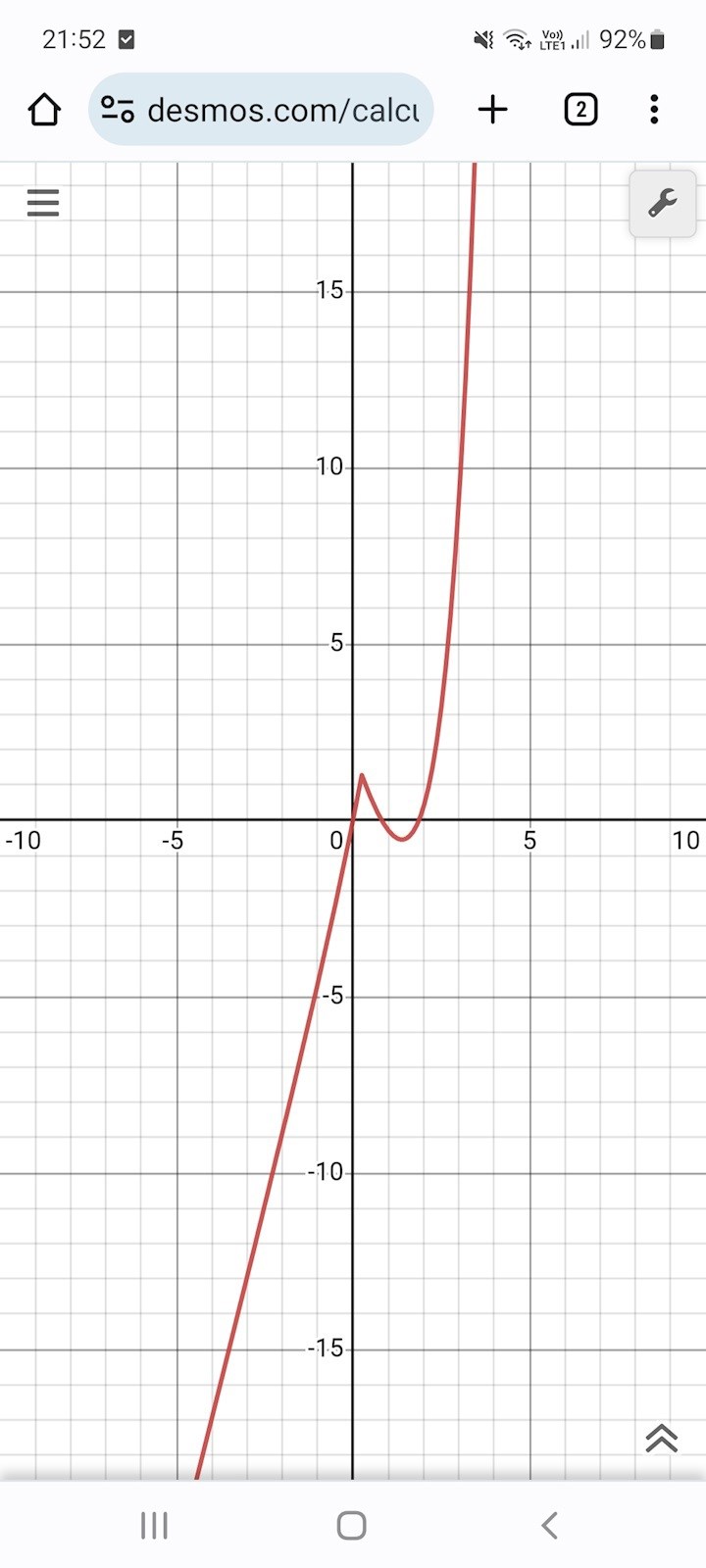 Så jag hade rätt gällande derivatans värde för x>=1/4 och x<1/4 dvs att den blir olika om man tittar på vänster och höger derivata. I klippet säger han att x=1/4 ej deriverbar och jag förstår ej vad han menar med det. Om e^x är definierad för hela reella axeln,vad är absolutbeloppet av 4x-1 ej är definierad för ? Menar man att dess derivata ej är det?