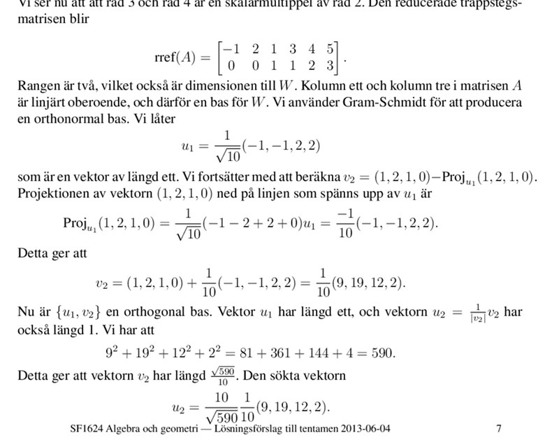 Denna fråga handlar om att hitta en ortonomal bas mha gram schmidtmetoden, och jag har då har vi funnit vektorerna v1=(-1,-1,2,2) och v2=(1,2,1,0) och använde då att sätta u1=v1 och använde gram schmidt för att räkna ut u2. Men de gjorde motsatsen i lösningsförslaget, i min lösning får jag att en ortonormal bas är 1/6(-5,-4,13,12) och de fick 1/10(9,19,12,2).