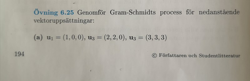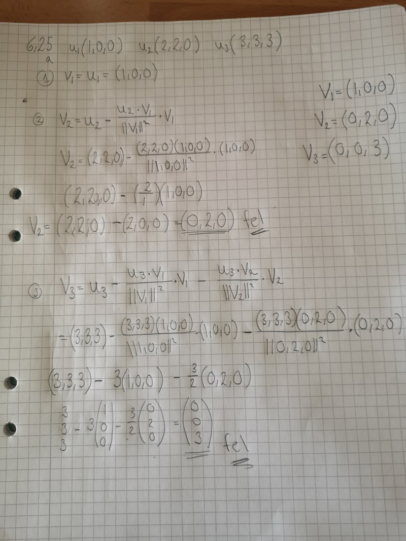 Jag har fastnat på den här uppgiften och får inte samma resultat som i facit, jag följer Gram-schmidt formeln men beräkning verkar inte stämma.