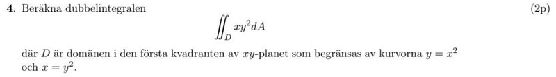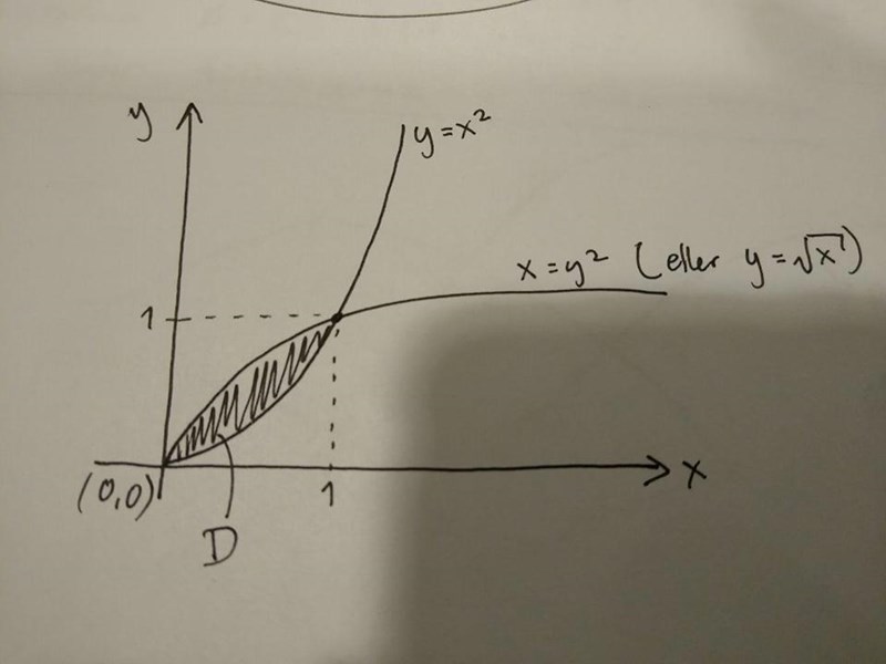 Jag tycker att gränserna borde bli (0<x<1) och (0<y<1) efter som att det är det är där kurvorna möts. Enligt facit är dock gränserna (0<x<1) och (x^2<y<sqrt(x)).