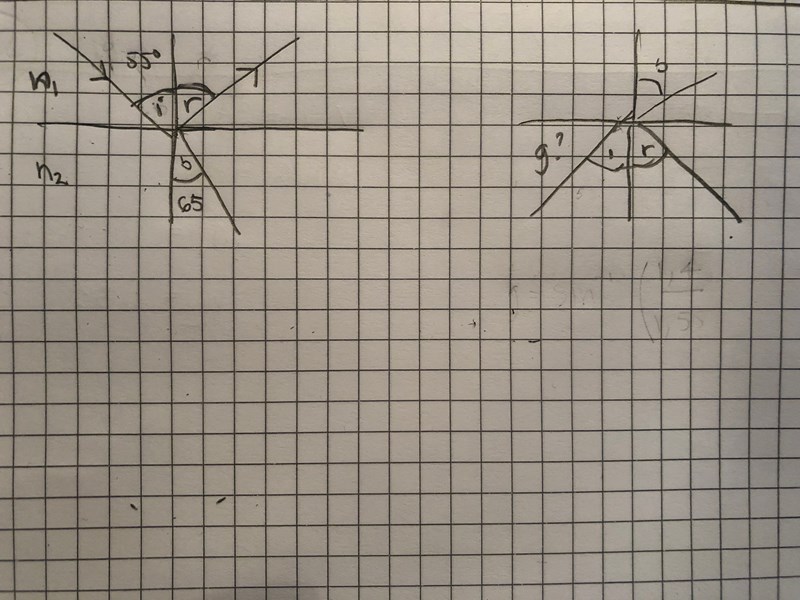 Det känns mer som jag inte fattar uppgiften. Jag vet ju att det är 90-65=25 grader mellan ytan och brytningsvinkeln även fast bilden är missvisande