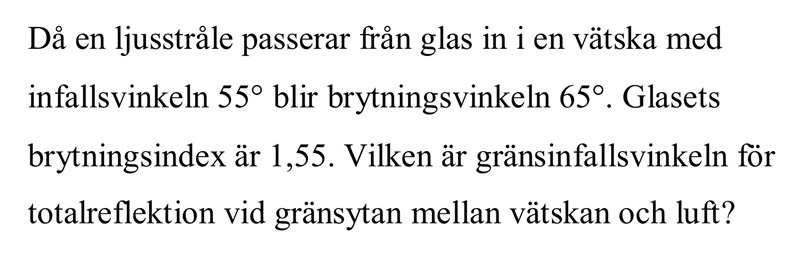Rita sedan en bild där infallsvinkeln är större än 55 grader. Hur stot blit brytningsvinkeln?
