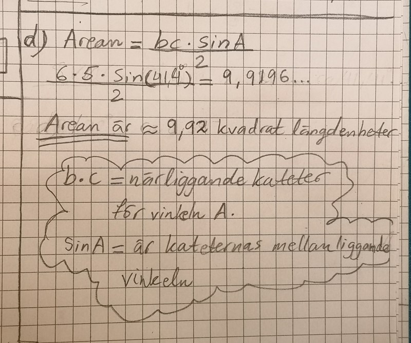Har ingen facit för de träningsuppgifter, jag löste a) och b) och tror att det stämmer men är inte riktigt säker på c) höjden vinkelrätt mot den längsta sidan. Är det att beräkna längden på höjden under B vinkeln så här;