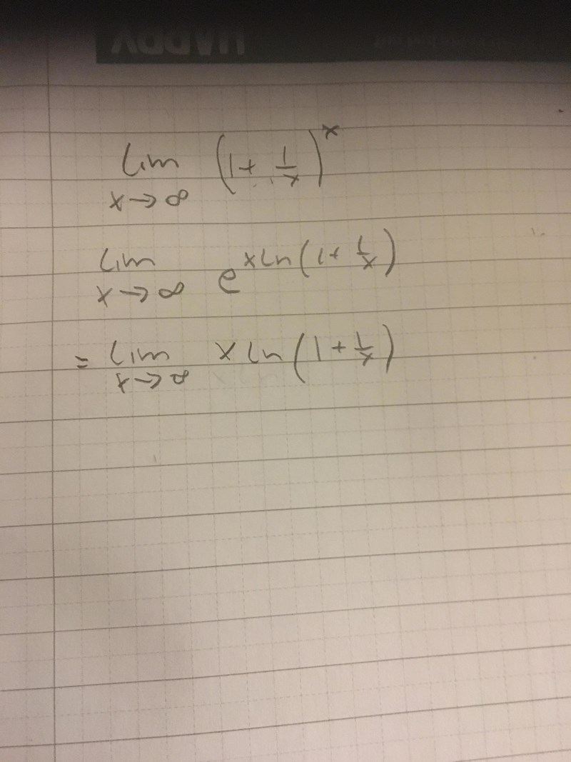 Ett sätt att göra det är med L'Hopitals regel på . Då får du att gränsvärdet går mot e^1 = e.