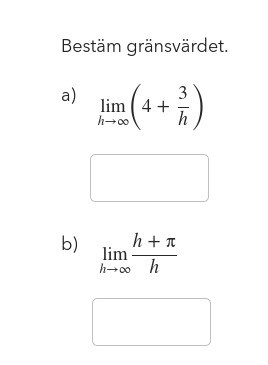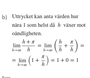 b) Om h är jättestort, så blir det ingen större skillnad mellan 1 000 0003,14... och 1 000 000 000 mellan 1 000 000 000 003,14... och 1 000 000 000 000 så kvoten närmar sig...