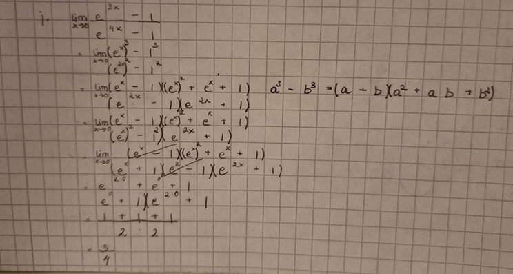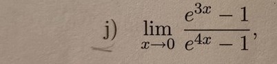 Här en variant på L’Hopital: Sätt f(x)=e3x och g(x)=e4x. Då är (e3x-1)/(e4x-1) = (e3x-1)/x•((e4x-1)/x)-1=
