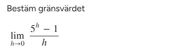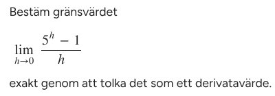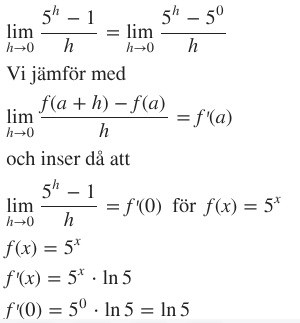 (Alternativa metoder skulle vara att skriva 5x som en serieutveckling. Eller med en exponentialfunktion av e.)